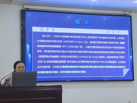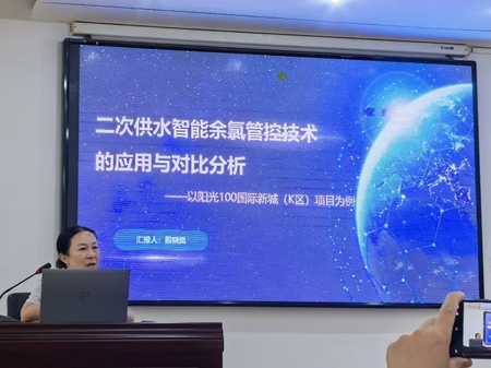 会上,济南水务集团管网管理部副部长殷晓岚部长发表了主题为《二次供水智能余氯管控技术的应用与对比分析——以阳光100国际新城(K区)项目为例》,针对该项目目前存在的水质安全风险进行了详细分析:因泵房进水余氯随管网用水情况波动不稳定,水龄长导致的水箱出水余氯不足的问题。研讨出解决该问题的最佳策略是实时对水箱自来水实施补氯,始终维持水箱出水余氯在一定浓度水平以上。 但是水箱补氯属于末端补氯,具有自身的特殊性。详细探讨了二次供水智能余氯管控技术要点,该技术也在阳光100国际新城项目得到了长达1年的实际应用,从运行结果并结合与传统的消毒设备对比分析出,二次供水水箱智能余氯管控技术确实是解决因水箱出水余氯不足而导致龙头水余氯不达标问题的最优技术路线,且符合智慧化泵房、智慧水务的建设要求。